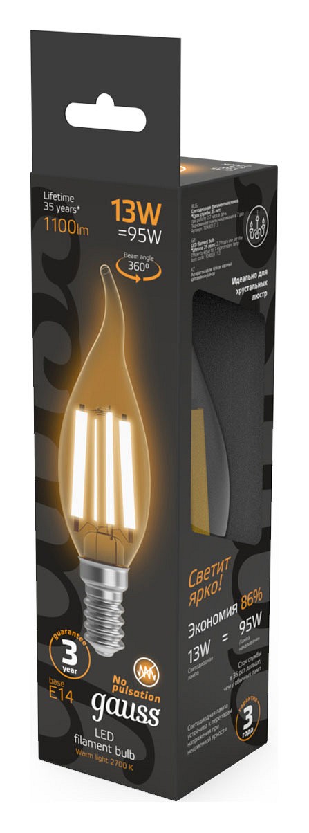 | Альтернативное название | Лампа светодиодная Gauss Filament E14 13Вт 2700K 104801113 |